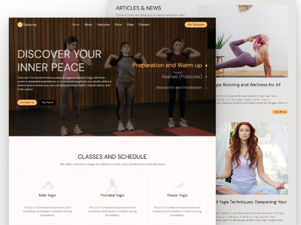 Whether you're a yoga instructor, meditation guide, or wellness center, this template provides all the essential features including class schedules, instructor profiles, booking options, and a tranquil blog space. Elevate your online presence with our Framer template and inspire visitors to embark on a journey of inner peace and well-being.